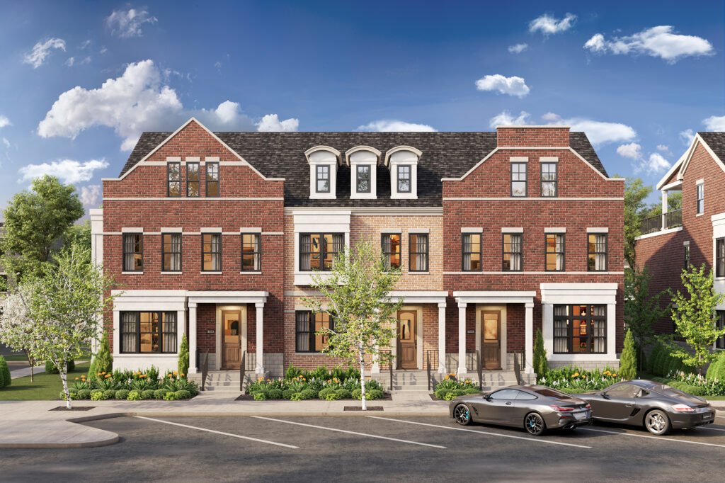 These three-story, classically designed brick and stone residences offer approximately 3,091–3,643 square feet with 3–4 bedrooms and expansive rooftop terraces. Features include 10-foot ceilings, private elevators, gourmet chef kitchens with Wolf, Sub-Zero, and Cove appliances, flexible first-floor living, and a third-floor flex space opening to a partially covered rooftop terrace. Rear-entry two-car garages with carriage-style doors complete the sophisticated urban-inspired aesthetic.